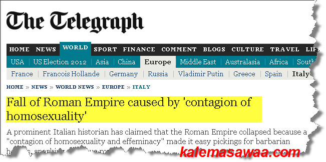 السلام عليكم ورحمة الله وبركاته اللهم صل على محمد وعلى آله وصحبه أجمعين اللواط و الشذوذ الجنسي هما السبب الرئيس وراء انهيار الامبراطورية الرومانية ، هذا ما صرّح به المؤرخ الايطالي و رئيس مجلس البحث الوطني الايطالي Roberto De Mattei البالغ من العمر 63 سنة . ![]() ![]() الدراسة التي اجراهاRoberto De Mattei خلصت الى كون أفول نجم الامبراطورية الرومانية العتيدة كان بعد حملة قرطاج ، هذه الأخيرة التي نعتها ب " جنة الشواذ جنسيا " . مصدر الخبر : the telegraph للمزيد من مواضيعي