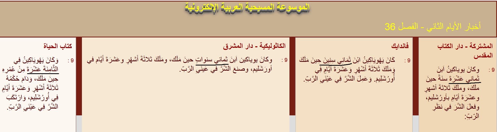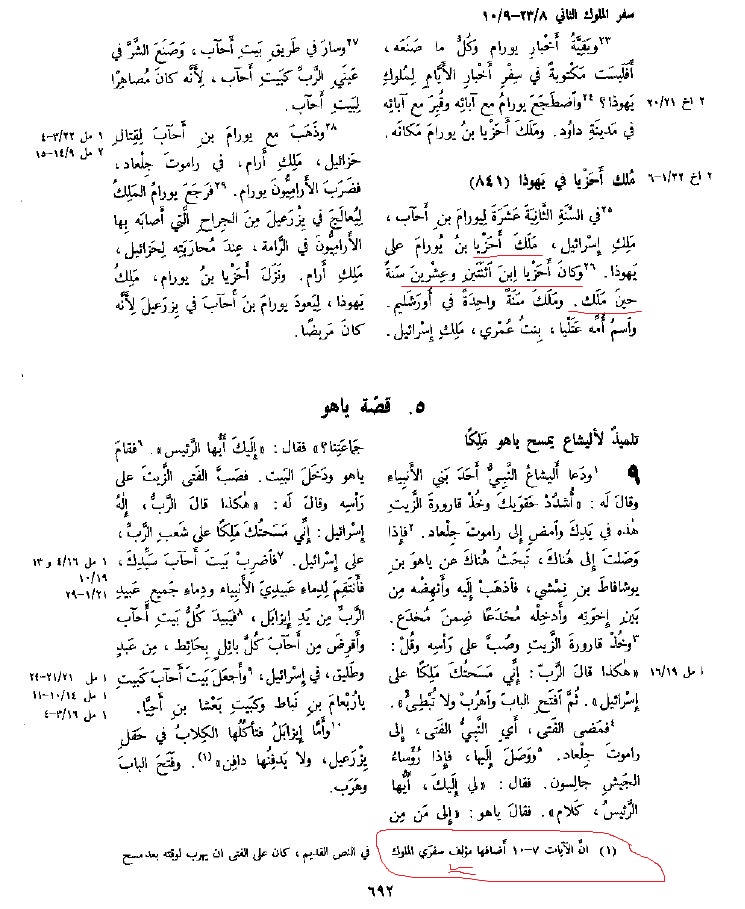 س : كم عمر يهوياكين عندما نصب ملكًا ؟ وما مدة حكمه؟ 18 أم 8 ؟؟؟؟؟؟؟؟؟؟؟؟؟؟؟ جـ : في سفر الملوك الثاني (24 : 8) : "كان يهوياكين ابن ثماني عشرة سنة حين ملك وملك ثلاثة أشهر في أورشليم" . بينما في أخبار الأيام الثاني (36 : 9) : "كان يهوياكين ابن ثماني سنين حين ملك وملك ثلاثة أشهر وعشرة أيام في أورشليم" . لاحظ في الصورة أنه نفس النص الترجمة المشتركة و كتاب الحياة قاموا بتزبيط النص ليوافق نص ملوك 2 بينما فاندايك و الكاثوليكية التزموا بالمخطوطة :::: لا مفــــــــــــر من الاعتــــــراف بـــوقـــوع التحـــــــــــــــــــريف ::: المزيد من مواضيعي