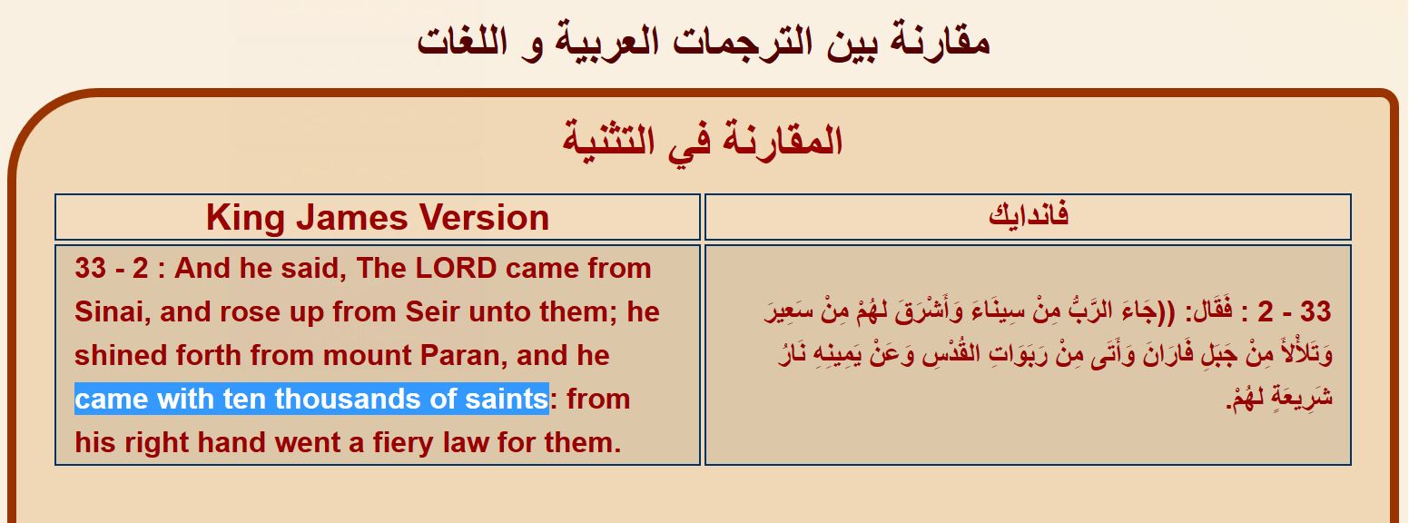 ترجمة الملك جيمس تنص على الرقم 10 آلاف صحابي : تثنية 33 - 2 : And he said, The LORD came from Sinai, and rose up from Seir unto them; he shined forth from mount Paran, and he came with ten thousands of saints: from his right hand went a fiery law for them. و السؤال هو : لماذا تعمدت الترجمات العربية حذف هذا الرقم ؟؟؟؟ ؟؟؟؟؟؟؟؟؟؟؟؟؟؟؟؟ أولا هذا تحريف ثانيا : الرقم 10 آلاف ، لماذا يتعمد المترجم إلى اللغة العربية إخفاءه ؟؟ ؟؟؟؟؟؟؟؟؟؟؟ ـــــــــــ المزيد من مواضيعي