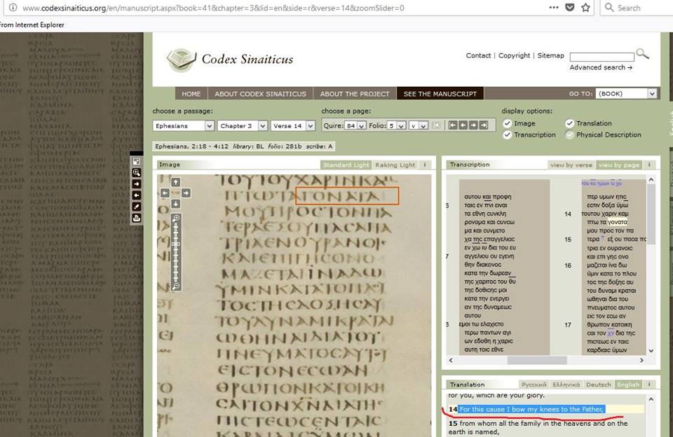 هل توافق على تحريف الكتاب لتدعيم فكر لاهوتي ؟؟؟؟؟ نص الكتاب المقدس أفسس 3: 14 يقول : لِهذا أَجْثو على رُكبَتَيَّ ساجداً لِلآب فيأتي المحرف و يضيف عبارة ( ربنا يسوع المسيح ) ــــــــ أدخل على هذا الرابط و تأكد بنفسك : أفسس ... 3 .... 14 .... 14 http://www.albishara.net/bible_read/compar/?nav_show=1 الترجمة المشتركة و الكاثوليكية و البولسية و كتاب الحياة لا توجد بها عبارة ( ربنا يسوع المسيح ) ترجمة فاندايك أضــــــاف العبارة من عند نفسه !!!! ـــــــــــــــــــ أدخل على هذا الرابط لتتأكد أن العبارة غير موجودة في نسخة الكتاب المقدس Weymouth New Testament http://m.biblestudyguide.org/ebooks/bibles/weymou.pdf ـــــــــــــــــــــ أدخل على هذا الرابط لتتأكد أن العبارة غير موجودة في نسخة الكتاب المقدس Bible in Basic English ــ https://www.simplish.org/media/docum..._850_words.pdf ـــــــــــــــــــــــــــــــــــــــ أدخل على هذا الرابط لتتأكد أن العبارة غير موجودة في نسخة الكتاب المقدس American Standard Version ــ http://www.heraldmag.org/olb/bsl/Lib...mrStnd/asv.pdf ـــــــــــــــــــــــــــــ أدخل على هذا الرابط لتتأكد أن العبارة غير موجودة في نسخة العهد الجديد اليوناني المنشورة عام 1881 و المعروفة باسم Hort and Westcott ــ http://www.westcotthort.com/books/We...nterlinear.pdf ــ و ستجد نهاية النص عند كلمة father Ephesians 3:14 toutou charin kamptw ta gonata mou pros OF THIS THANKS I AM BENDING THE KNEES OF ME TOWARD 3778_4 5484 2578 3588 1119 1473_2 4314 ton patera THE FATHER, 3588 3962 ـــــــــــــــــــــــــ أدخل على هذا الرابط لتتأكد أن العبارة غير موجودة في المخطوطة السينائية و هو نفس نص المخطوطة السكندرية Alexandrian toutou carin kamptw ta gonata mou proV ton patera ــــــــــــــــــــــــــــ http://www.codexsinaiticus.org/en/manuscript.aspx ــ 14 For this cause I bow my knees to the Father, ــــــــــــــــــــــــــــــ و هذه صورة المخطوطة ــــــــــــــــــــــــــــــــــــــــــــــــــ ــــــــــــــــــــــــــــــــــــــــــــــــــ ـــ ــــــــــــــــــــــــــــــــــــــــــــــــــ ــــــــــــــــــــــــــــــــــــــــــــــــــ ـــ ترجمة فاندايك أضــــــاف عبارة ( ربنا يسوع المسيح ) من عند نفسه !!!! 14 : بِسَبَبِ هَذَا أَحْنِي رُكْبَتَيَّ لَدَى أَبِي رَبِّنَا يَسُوعَ الْمَسِيحِ، ــــــــــــــــ طبعة الملك جيمس أضــــــاف عبارة ( ربنا يسوع المسيح ) من عند نفسه !!!! King James Version 3:14 For this cause I bow my knees unto the Father of our Lord Jesus Christ, ــــــــــــــــــــ النسخ التالية أضافت العبارة من افتقاس المؤلف :: Darby's English Translation 3:14 For this reason I bow my knees to the Father of our Lord Jesus Christ, Douay Rheims 3:14 For this cause I bow my knees to the Father of our Lord Jesus Christ, Noah Webster Bible 3:14 For this cause I bow my knees to the Father of our Lord Jesus Christ, World English Bible 3:14 For this cause, I bow my knees to the Father of our Lord, Jesus Christ, Young's Literal Translation 3:14 For this cause I bow my knees unto the Father of our Lord Jesus Christ, ــــــــــــــــــــــــــــــ إذن هذا النص موجود في بعض النسخ و غير موجود في البعض الآخر يعني هذا نص تم تحـــــــــــريفه و تدخلـــــــــــت فيـــه يد بشرية و قامت باضافته حسب هوى المؤلف المزيد من مواضيعي