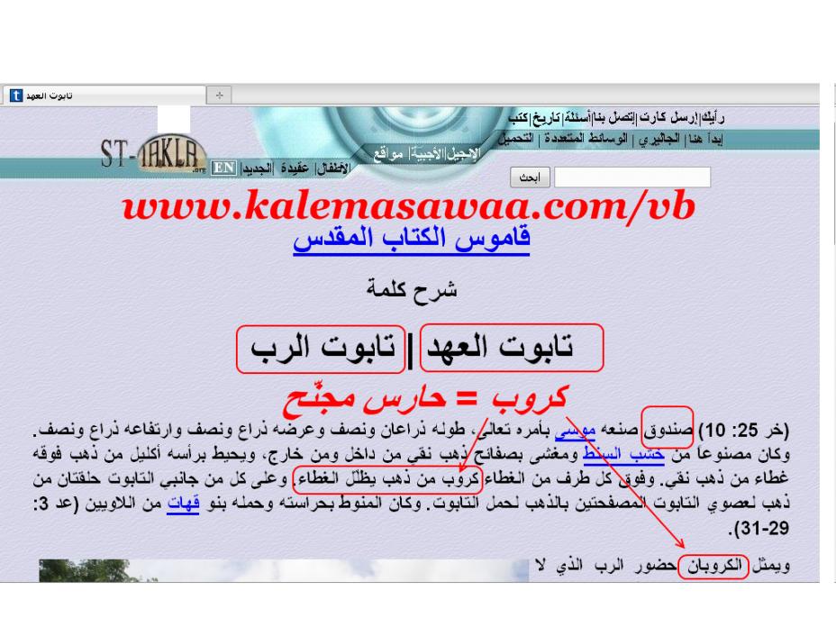 ![]() اللهم صل وسلم على سيدنا محمد وعلى آله وصحبه أجمعين سلاما مزيدا مباركا الى يوم الدين يُعرّف موقع التكلا تابوت العهد كالآتي : ![]() نجد له صورة في الموقع ذاته ( موقع التكلا ) ، كاهنيسجد أمام تابوت العهد ، لا أدري لم يسجد هذا الكاهن لقطعة خشب بدل السجود لله الواحد الاحد ؟؟؟؟؟؟ ![]() لاحظوا جيدا صورة الحارسين المجنحين ( الشاروبيم ) فوق تابوت الرب : ![]() http://st-takla.org/Gallery/Bible/01...rk-priest.html المفاجأة الكبرى !!!! ![]() الفراعنة أيضا - والذين سبقوا العبرانيين بقرون - قدّسوا أيضا تابوتا هو صورة طبق الأصل من تابوت العهد : ![]() ![]() ![]() ![]() لاحظوا وجود الحارسين المجنحين أيضا فوق تابوت الفراعنة : ![]() ![]() دليل آخر على كون تابوت العهد مستوحى من الفراعنة : ![]() تابوت ايزيس : ![]() تابوت توت عنخ آمون : ![]() http://www.lexiline.com/lexiline/lexi557.htm للمزيد من مواضيعي