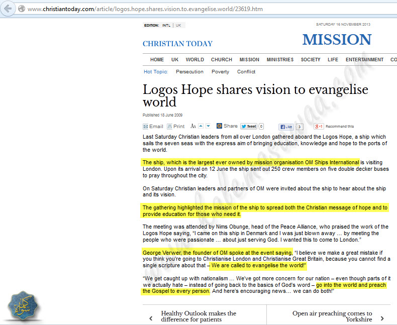 تقوم سفينة لوجوس هوب Logos Hope بمهمام تنصيرية حول العالم تحت ستار نشر الثقافة والتعرف على الآخر حيث أن واجهة أنشطتها هي العمل كمعرض كتاب عائم يجوب موانئ العالم، وذلك تحت إشراف شركة Mobilization Orgnization