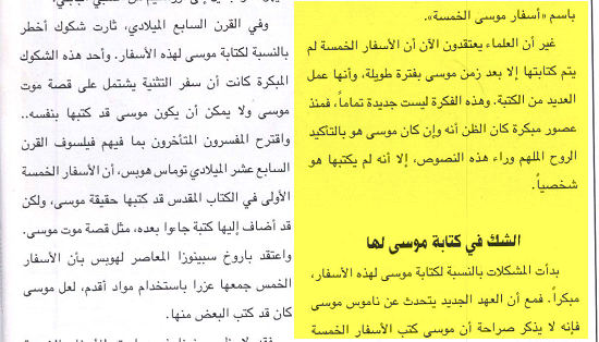 بسم الله الرحمن الرحيم هل هو موسى عليه السلام ؟ ام شخص اخر؟ ام مجهول؟الحمد لله نحمده , ونستعين به ونستغفره , ونعوذ بالله تعالى من شرور أنفسنا ومن سيئات أعمالنا , من يهده الله فلا مُضِل له , ومن يضلل فلن تجد له وليّاً مرشداً , وأشهد أن لا إله إلا الله وحده لا شريك له , وأشهد أن محمداً عبده ورسوله , وصفيه من خلقه وخليله , بلَّغ الرسالة , وأدى الأمانة , ونصح الأمة , فكشف الله به الغمة , ومحى الظلمة , وجاهد في الله حق جهاده حتى آتاه اليقين , وأشهد أن عيسى ابن مريم عبد الله ورسوله , وكلمته ألقاها إلى مريم وروح منه . ثم أما بعد ؛ «اللَّهُمَّ رَبَّ جِبْرَائِيلَ وَمِيكَائِيلَ وَإِسْرَافِيلَ فَاطِرَ السَّمَوَاتِ وَالأَرْضِ عَالِمَ الْغَيْبِ وَالشَّهَادَةِ أَنْتَ تَحْكُمُ بَيْنَ عِبَادِكَ فِيمَا كَانُوا فِيهِ يَخْتَلِفُونَ اهْدِنِى لِمَا اخْتُلِفَ فِيهِ مِنَ الْحَقِّ بِإِذْنِكَ إِنَّكَ تَهْدِى مَنْ تَشَاءُ إِلَى صِرَاطٍ مُسْتَقِيمٍ »(صحيح مسلم-1847). من هم الذين كتبوا الاسفار الخمسة الاولى للعهد القديم ؟ براءة موسى من الاسفار المنسوبه اليه يدعي الأصدقاء المسيحيون أن التوراة الحالية هي من كتابة موسى نفسه عليه السلام ، إلا أن هناك عدة شواهد وأدلة في التوارة الحالية تؤكد انها ليست من كتابة موسى وأن مؤلفها وكاتبها شخص آخر عاش بعد موسى بزمن طويل وهذا دليل تحريفها وضياعها وهذا ليس كلامى بل هو كلام علماء النصارى نقلا عن كتاب تاريخ الكتاب المقدس صفحة 28 يقول نصاً كما هو واضح فى الصورة يوجد شك فى من هم كتبة التوارة ويعتقد الكثير من العلماء ان موسى عليه السلام ليس هو من كتبها وفى الكتاب المذكور انفا يقول ايضا فى صفحة30 يجزم بان الكاتب ليس موسى وا حتى اى شخص اخر ... اذاً الكاتب مجهول . و هذا معناه ان التوراة ليست من كتابة موسى عليه السلام باعتراف النصارى أسفار موسى الخمسة منسوبة زرواً لموسى عليه الصلاة والسلام .... لا يوجد دليل أبداً أو بمعني أصح إعلان من موسى نفسه أنه هو من كتب هذه الأسفار حتى أننا نقرأ بأن صيغة كلمات موسى لا يمكن أن تصدر من موسى نفسه ونأخذ على سبيل المثال : ( وقال الرب لموسى) سفر اللاويين 4/1 (وقال الرب لموسى) العدد 3/5 (وهذه هي البركة التي بارك بها موسى ) التثنية 33/1 الكثير من النصوص الموجودة في هذه الأسفار لا يمكن بحال من الأحوال أن تُنسب لموسى عليه السلام للمزيد من مواضيعي