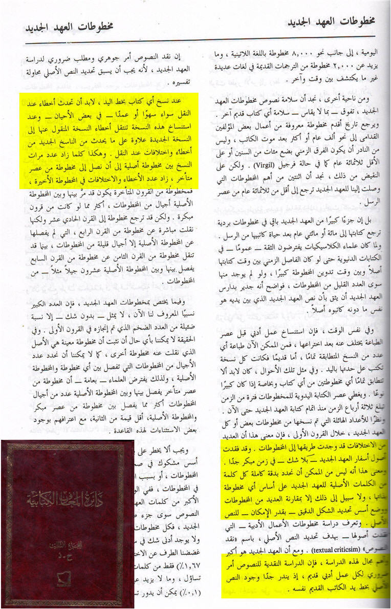 وننقل لكم ما ورد في دائرة المعارف الكتابية حرف (أ) تحت عنوان الكتاب المقدس والنقد