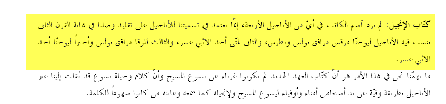 يعترف ان الاناجيل لم يكون مكتوب عليه اسم الكاتب، اذا ماذا يقول تحت ( كتاب الانجيل: لم يرد اسم الكاتب فى اى من الاناجيل الاربعة انما نعتمد فى تسميتنا للا ناجيل على تقليد وصلنا فى نهاية القرن الثاني ينسب فيه الاناجيل، ليوحنا مرقس مرافق بولس وبطرس، والثانى لمتى احد الاثنى عشروالثالث للوقا مرافق بولس واخير ليوحنا احد الاثنى عشر)