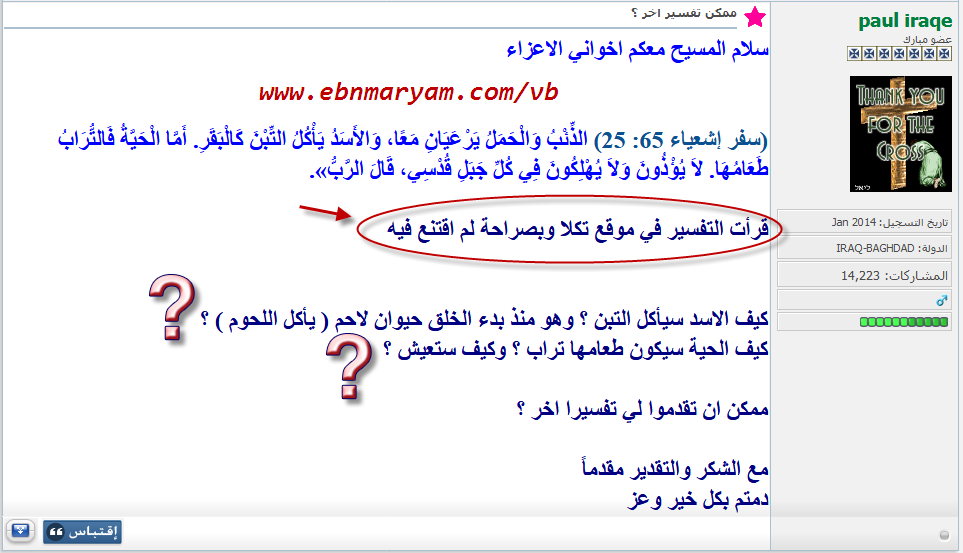 ![]() اللهم صل على محمد وعلى آله وصحبه أجمعين ،، دليل جديد على أنّ تفاسير كتاب النصارى المقدّس الزئبقية ، الهلامية ، البهلوانية لم تعد مقنعة للمنصرّين الــ VIP ( المُباركين ) فمابالكم بعوام النّصارى ! ![]() ![]() تدخل أحد لصوص الأديان و قُطّاع طرق الشريعة لتثبيت إيمان أخيه في المعمودية عن طريق تقديم رابط يُحيل إلى ما يُسمّى ردّا بقلم المدّلس هولي بايبل فجاءته الصّاعقة من حيث لا ينتظر ! ![]() ![]() للمزيد من مواضيعي