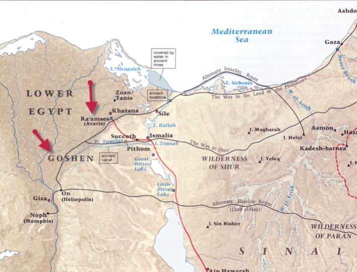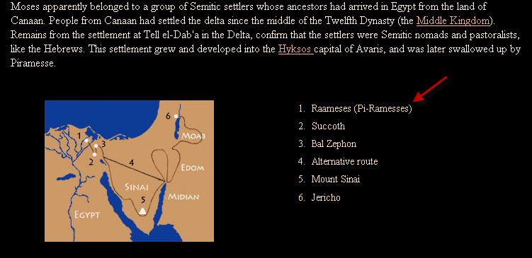 شكرا للضيف الكريم الذي أكد مرّة ثانية وفي مواطن عديدة بأن رعمسيس هي مدينة وليست (أرض رعمسيس )، و بانها هي نقطة انطلاق رحلة خروج العبرانيين من مصر دليل آخر على كون رعمسيس هي مدينة و ليست (أرض رعمسيس) ، ومن قاموس كتابكَ الذي تقدس ، رعمسيس ( Raamses ) هي كبرى مدن منطقة GOSHEN وقد اتخذها العبرانيون نقطة تجمع وانطلاق رحلة هروبهم من مصر : ![]() الخريطة التالية تبين نقطة انطلاق رحلة العبرانيين من مدينة رعمسيس و التي تسمى أيضا بي - رمسيس : ![]()