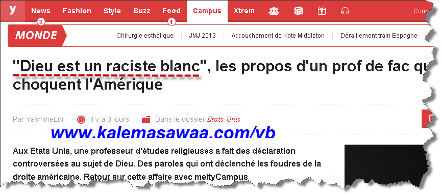 ![]() اللهم صل على محمد وعلى آله وصحبه أجمعين بدون خجل يتطاول نصارى الغرب على معبودهم واصفين إياه بأوصاف مشينة ...! خبر على أحد المواقع الفرنسية بعنوان : ((( الربّ عنصري و أبيض البشرة ))) ![]() ![]() الربّ عنصري و أبيض البشرة ، تصريحات أستاذة جامعية بــ بنسيلفانيا التي صدمت الولايات المتحدة .