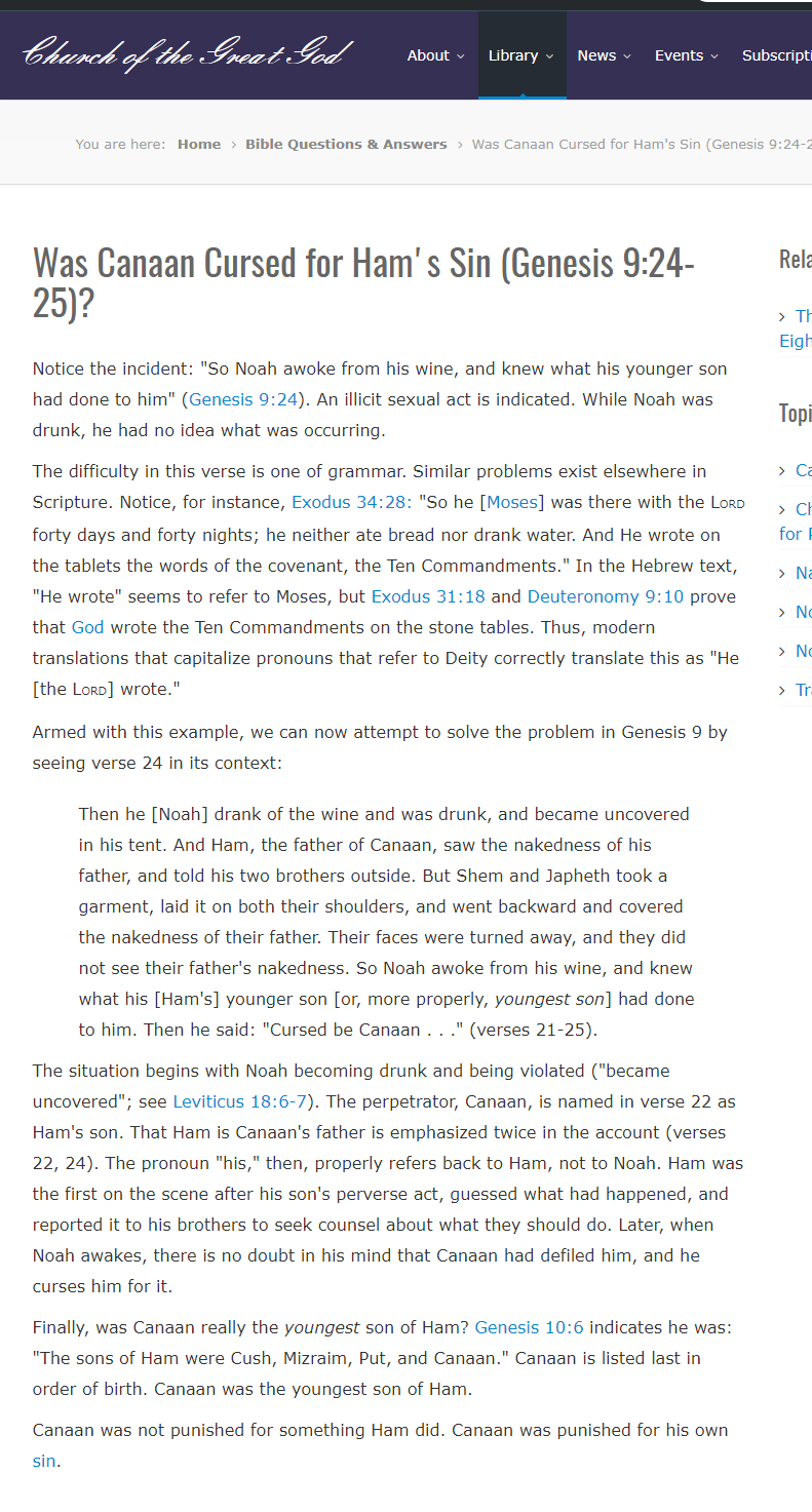 كان حام أول من ظهر على الساحة بعد تصرف ابنه المنحرف ، وخمن ما حدث ، أبلغ إخوته وطلب المشورة بخصوص ما يجب عليهم فعله. لا حقاً عندما استيقظ نوح لم يشك لحظة في ما فعله كنعان (عرف أن كنعان قد نجّسه / اغتصبه ) ، و لذلك لعنه . Church of the Great God |