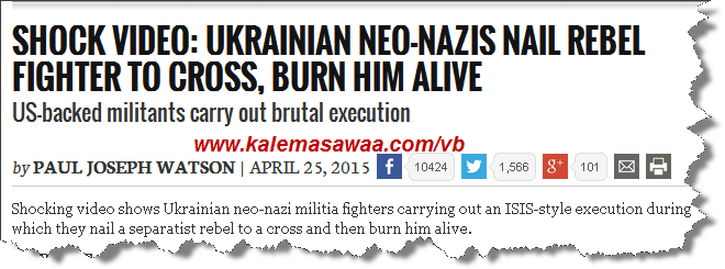 ![]() اللهم صل على محمد وعلى آله وصحبه أجمعين ، في مشهد وحشي بربري مروّع أقدم نازيون أوكرانيون جدد على صلب و حرق أحد ( المتمردين ) . ![]() لم تشفع صرخات و توسلات المصلوب أمام إصرار و تصميم أفراد الميليشيا الأوكرانية المسمّاة Azov الذين غالبا ما يعتمرون خوذات عسكرية تحمل شعار وحدات الـ فافن إس إس النازية الشهيرة - الصورة على اليمين - زيادة على شعار الرايخ الثالث النازي ( صليب معقوف ) ![]() http://www.nbcnews.com/storyline/ukr...ldiers-n198961 مشهد الصلب : ![]() ثم الحرق : ![]() للمزيد من مواضيعي