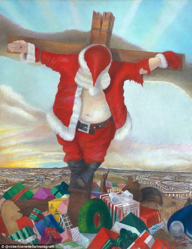 اللوحة الفنية التي رسمها الفنان روبرت سينيديلا، ويظهر فيها سانتا كلوز وهو معلق على الصليب، أثارت غضب المواطنين لتشبيه بابا نويل بالمسيح معلقاً على الصيب وكأنه هو من اصبح فادي البشرية.
