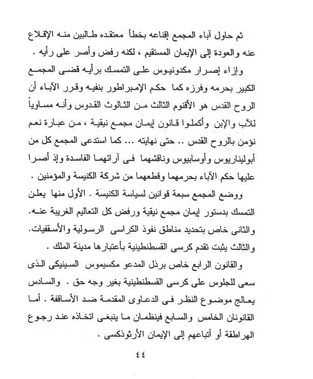 يعنى العهدة على آباء الكنيسة فى معرفة الإيمان الصحيح و هو شئ غريب فعلا لم لا تكون العقيدة الصحيحة واضحة بنصوص يقولها المسيح و تنتهى القصة و ينتهى أى خلاف حول الإيمان ؟ ثم إن آباء الكنيسة اختلفوا فيما بينهم فى الإيمان فمنهم من اتبع آريوس القائل بأن الابن ليس من جوهر الأب و أنه أول خليقته و منهم من اتبع أثناسيوس القائل بأن الابن من نفس جوهر الأب فكيف تكون العهدة عليهم فى معرفة الإيمان الصحيح و هو يختلفون فيما بينهم و كل فريق منهم يعتبر الآخر مهرطق ؟ و نجد الدولة الرومانية فى فترة من الفترة تعتبر الأريوسية هى المسيحية الرسمية بالنسبة لها ثم تعود للأثناسيوسية ؟ نجد أن أكثر من ألف قس كانوا ينكرون ألوهية المسيح فى مجمع نيقية نقلا عن الموسوعة المسيحية العربية http://www.christusrex.org/www1/ofm/1god/pensieri/arianesimo.htm