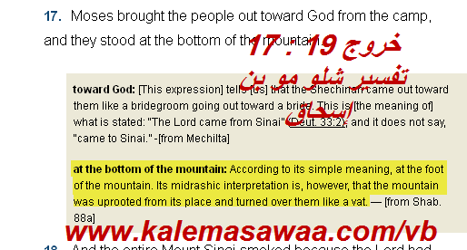 ![]() اللهم صل على محمد وعلى آله وصحبه أجمعين ،، يقول الحق جلّ و علا : ![]() وَإِذْ نَتَقْنَا الْجَبَلَ فَوْقَهُمْ كَأَنَّهُ ظُلَّةٌ وَظَنُّوا أَنَّهُ وَاقِعٌ بِهِمْ خُذُوا مَا آتَيْنَاكُم بِقُوَّةٍ وَاذْكُرُوا مَا فِيهِ لَعَلَّكُمْ تَتَّقُونَ الأعراف : 171 ![]() كثير من الحاخامات اليهود لا يجدون حرجاً في تقديم تفاسير تُطابق تماماً ما جاء في قرآننا الكريم . البعض منهم- كالراباي David Rosen - قد يذهب بعيداً إلى حدّ الإعتراف بسيّدنا محمد صلّى الله عليه وسلّم كنبيّ أمَمِيّ ( من غير جنس اليهود ) . أثناء الردّ على شبهة ( أجسام طائرة بالقرآن ) وجدت أنّ المفسّرين اليهود يقولون صراحة أنّ ربّ التوراة قد رفع جبل الطور فوق رؤوس بني إسرائيل و قال لهم : لإن لم تقبلوا التوراة لأدفننكم تحته ! التفسيرات اليهودية أشارت للحادثة من خلال ربطها بنص خروج 19 : 17 وَأَخْرَجَ مُوسَى الشَّعْبَ مِنَ الْمَحَلَّةِ لِمُلاَقَاةِ اللهِ، فَوَقَفُوا فِي أَسْفَلِ الْجَبَلِ. وهذه عيّنة ، تفسير للراباي شلومو بن اسحاق : ![]() فتحتُ مواقع نصرانية لأعرف رأي مفسّري النّصارى في هذه النّازلة فما وجدتُ إلاّ قفزات بهلوانية ! مفسّروا النّصارى تحاشوا وضع تفسير لنص خروج 19 : 17 فما هو السبب يا ترى ؟؟؟ ![]() من جديد يصدق قول الحقّ جلّ و علا : وَمَا قَدَرُوا اللَّهَ حَقَّ قَدْرِهِ إِذْ قَالُوا مَا أَنزَلَ اللَّهُ عَلَى بَشَرٍ مِّن شَيْءٍ قُلْ مَنْ أَنزَلَ الْكِتَابَ الَّذِي جَاءَ بِهِ مُوسَى نُورًا وَهُدًى لِّلنَّاسِ تَجْعَلُونَهُ قَرَاطِيسَ تُبْدُونَهَا وَتُخْفُونَ كَثِيرًا الأنعام :91 للمزيد من مواضيعي