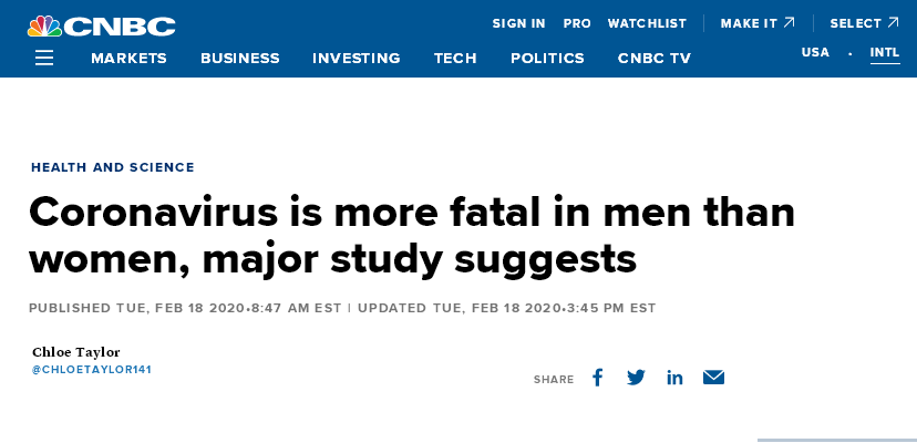 نقلاً عن موقع صحيفة الواشنتون بوست : بإيطاليا فايروس كورونا يفتك بالرجال أكثر من النساء ! 70% من الوفيات بسبب فايروس كوفيد-19 هم رجال . ![]() رابط الخبر: https://www.washingtonpost.com المزيد من مواضيعي