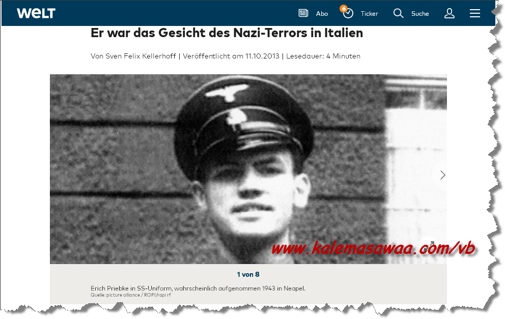 السجلات الكنسية الرّسمية - المقطع أعلاه - وثّقت لهروب و إعادة تعميد أحد قادة وحدات الفافن - إس إس الدّمويين و إبن من أبناء الكنيسة المدلّلين : Erich Priebke ( الصورة أدناه ) ![]() النّازيErich Priebke الملطّخة يداه بدماء الأبرياء إرتكب جرائم وحشية في حق مدنيين بإيطاليا الفاشية ، و بفضل الوثائق المزوّرة التّي منحته الكنيسة الكاثوليكية تمكّن من الإفلات من العقاب عقب محاكمات نورنبيرغ الشّهيرة بعد هروبه للأرجنتين تحت إسم وهوية جديدين ! ![]() ![]() يُتبع بمشيئة الرحمن ... المزيد من مواضيعي