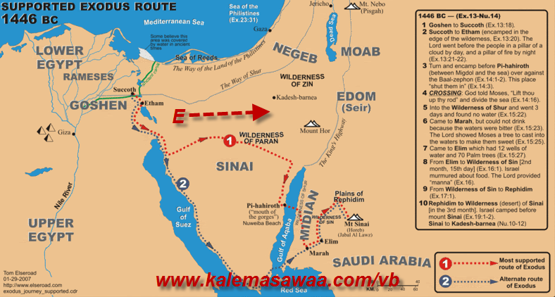 ![]() اللهم صل على محمد وعلى آله وصحبه أجمعين ،، الجميع بالتّاكيد يعرف قصة خروج العبرانيين من مصر طلبا للنّجاة من بطش فرعون و أزلامه ، لكن ؟؟ هل تخيّل أحدكم يوما المسار الذي اتبعه العبرانيون في رحلة العبور الكبير ؟؟؟ ![]() ![]() أهو إلى ناحية الجنوب كما يُحاول البعض تصوير ذلك و لغرض في نفس يعقوب ؟؟؟ ![]() أم هو إلى ناحية الشّرق كما أخبرنا القرآن الكريم ؟؟؟ يقول الحق في سورة الشعراء أية 60 : ![]() لنقف على حقيقة الأمر إليكم تفسير الآية الكريمة أعلاه : تفسير القرطبي : وقال أبو عبيدة : معنى فأتبعوهم مشرقين ناحية المشرق . وقرأ الحسن وعمرو بن ميمون : ( فاتبعوهم مشرقين ) بالتشديد وألف الوصل ; أي نحو المشرق ; مأخوذ من قولهم : شرق وغرب إذا سار نحو المشرق والمغرب . تفسير ابن عاشور : { مشرقين } حال من الضمير المرفوع يجوز أن يكون معناه قاصدين جهة الشرق يقال : أشرق ، إذا دخل في أرض الشرق ، كما يقال : أنجد وأتهم وأعرق وأشأم ، ويعلم من هذا أن بني إسرائيل توجهوا صوب الشرق وهو صوب بحر ( القلزم ) وهو البحر الأحمر وسمي يومئذ بحر سُوف وهو شرقي مصر . ![]() ![]() ![]() إليكم مجموعة من الخرائط التي تبين مسار العبور ، نقطة التجمّع/ الإنطلاق : أرض كوشين ( Land of Goshen ) نقطة الوصول : جبل الشريعة/ سيناء/ حوريب (مدين - المملكة العربية السعودية ) . الإتجاه : شرقا * المسار رقم 1 هو المرجّح في الخريطة أدناه ![]() ![]() خريطة لرون وايت : ![]() - و الله أعلم - للمزيد من مواضيعي