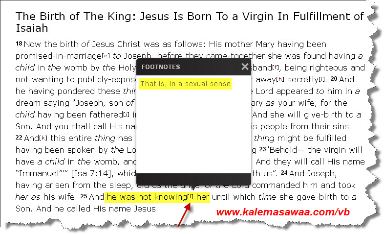 ولم يعرفها حتى ولدت ابنها البكر. ودعا اسمه يسوع. قساوسة النصارى و مواقعهم تدلّس على عوام النصارى بالقول : ![]() " علاقة الكهل يوسف النجار بأم الإله كانت علاقة زوجية صورية فقط " ![]() المنصّرون ومن يدور في فلكهم من القساوسة الناطقين باللغة العربية يستطيعون التدليس على النصارى العرب لكن ليس على العجم ! لأننا أمـّة الدّليل ،، نص متى 1 : 25 DLNT Disciples’ Literal New Testament و نقرأ في الهامش : عبارة And he was not knowing her ( لم يعرفها) تحمل معنى جنسي !!! ![]() يُتبع بالمزيد من صواعق الحقّ >>> المزيد من مواضيعي