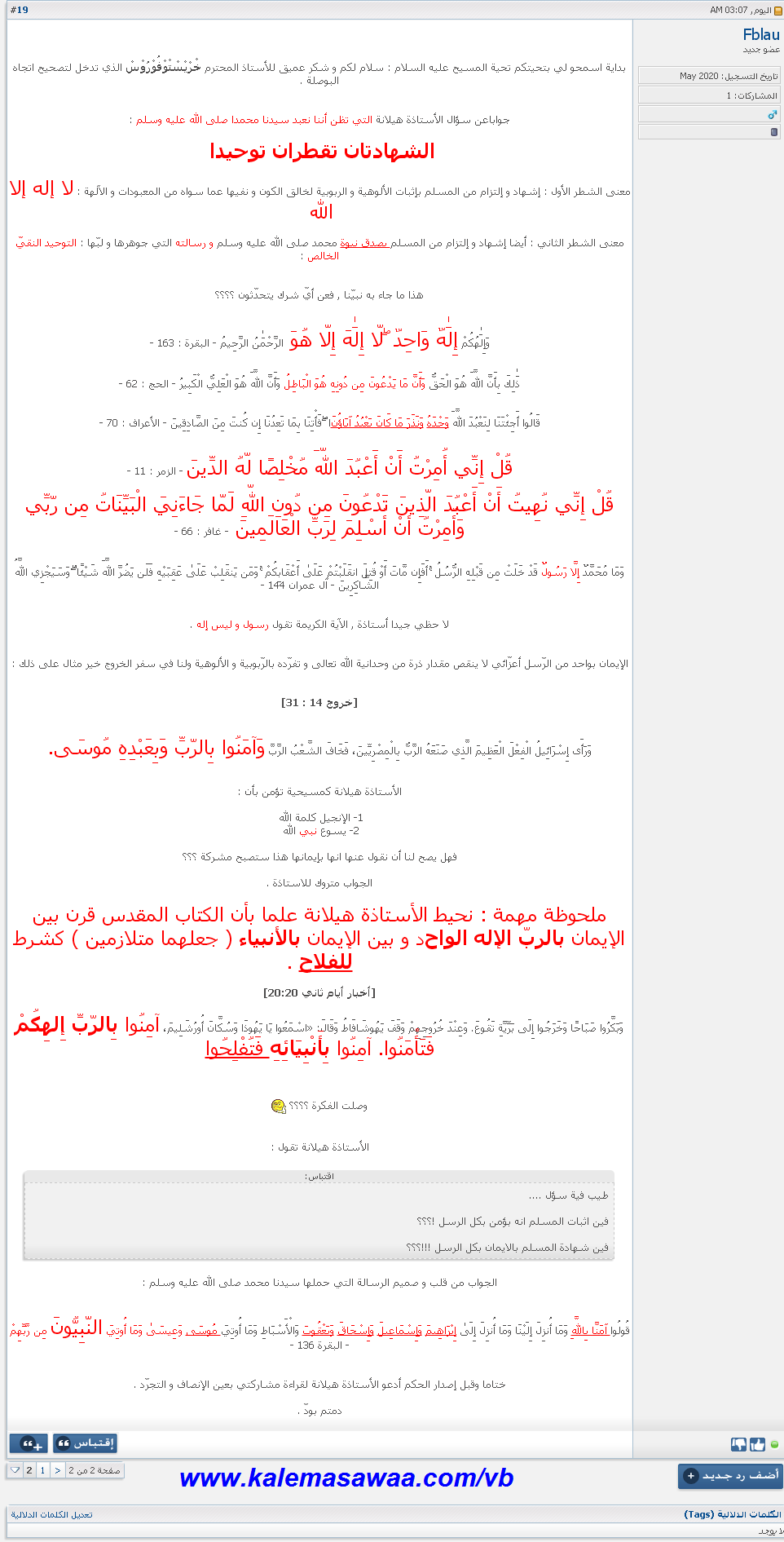 الردّ على أكاذيب المنصّرة كان من خلال : 1- إثبات كون الشهادتين في الإسلام تشملان كل معاني التوحيد . 2- عبر سيل من الآيات القرآنية تم إثبات كون النبي الخاتم سيدنا محمد صلى الله عليه وسلم لم يُنصّب نفسه إلهاً ، بل كرسول داع إلى نبذ الشرك و إفراد الألوهية و الرّبوبية لله الربّ ، الإله الحقّ ، الواحد . 3- عبر شواهد كتابية سفر الخروج 14 : 31 و سفر أخبار الأيام الثاني 20 : 20 تم إثبات كون المسيحية لا تجد حرجاً في جمع منتسبيها بين الإيمان بالله و إيمانهم بالأنبياء كشرط للفلاح . ![]() 4- دفع مزاعم المنصّرة الحقودة بإثبات إيمان المسلمين بجميع الأنبياء .
