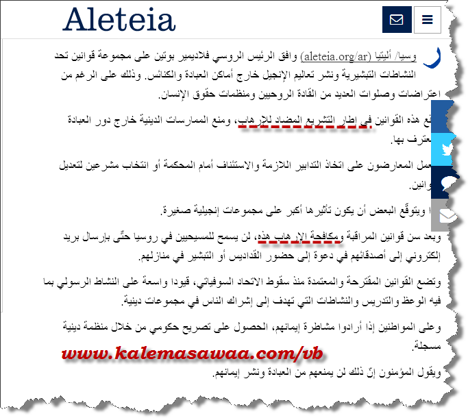 ![]() اللهم صل على محمد وعلى آله وصحبه أجمعين ،، روسيا تعتبر التبشير و الكرازة خارج الكنائس و دور أماكن العبادة إرهابا !! ![]() الخبر هو على عهدة موقع : أليتيا - عربيالمسيحي و الذي جاء فيه : روسيا/ أليتيا (aleteia.org/ar) وافق الرئيس الروسي فلاديمير بوتين على مجموعة قوانين تحد النشاطات التبشيرية ونشر تعاليم الإنجيل خارج أماكن العبادة والكنائس. وذلك على الرغم من اعتراضات وصلوات العديد من القادة الروحيين ومنظمات حقوق الإنسان. وتقع هذه القوانين في إطار التشريع المضاد للإرهاب، ومنع الممارسات الدينية خارج دور العبادة المعترف بها. ويعمل المعارضون على اتخاذ التدابير اللازمة والاستئناف أمام المحكمة أو انتخاب مشرعين لتعديل القوانين. هذا ويتوقّع البعض أن يكون تأثيرها أكبر على مجموعات إنجيلية صغيرة. وبعد سن قوانين المراقبة ومكافحة الإرهاب هذه، لن يسمح للمسيحيين في روسيا حتّى بإرسال بريد إلكتروني إلى أصدقائهم في دعوة إلى حضور القداديس أو التبشير في منازلهم. وتضع القوانين المقترحة والمعتمدة منذ سقوط الاتحاد السوفياتي، قيودا واسعة على النشاط الرسولي بما فيه الوعظ والتدريس والنشاطات التي تهدف إلى إشراك الناس في مجموعات دينية. وعلى المواطنين إذا أرادوا مشاطرة إيمانهم، الحصول على تصريح حكومي من خلال منظمة دينية مسجلة. ويقول المؤمنون إنّ ذلك لن يمنعهم من العبادة ونشر إيمانهم. المصدر: أليتيا - عربي للمزيد من مواضيعي