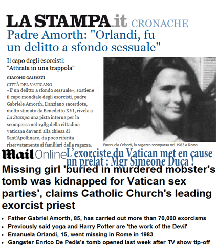 شكراً أخي ـ دائماً تأتينا بالأخبار القيمة! هنا الخبر بالإنكليزية على موقع russia today Published: 23 May, 2012, 17:15 THE OUTSPOKEN PRIEST SAYS THE SCHOOLGIRL WAS SNATCHED FROM THE STREETS OF CENTRAL ROME IN THE SUMMER OF 1983 AND FORCED TO TAKE PART IN SEX PARTIES. "THIS WAS A CRIME WITH A SEXUAL MOTIVE. PARTIES WERE ORGANIZED, WITH A VATICAN GENDARME ACTING AS THE 'RECRUITER' OF THE GIRLS,” FATHER AMORTH, 85, TOLD LA STAMPA NEWSPAPER. http://www.rt.com/news/girl-vatican-sex-priest-975/ المزيد من مواضيعي