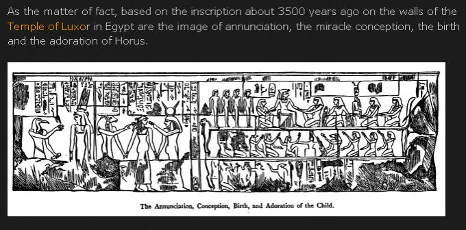![]() السلام عليكم ورحمة الله وبركاته اللهم صل على محمد وعلى آله وصحبه أجمعين تشابه رهيب يصل الى حد التطابق بين يسوع معبود الكنيسة وحورس اله الفراعنة القدماء : حورس وُلد من عذراء ، حمل البشارة بميلاد الصبي حورس الروح القدس الفرعوني الطائرknep ، الحادثة وثقتها جدارية بمعبد الأقصر : ![]() حورس - شأنه في ذلك شأن اله النصارى - تمّ تعميده أيضا على يد ANUP مصدر الوثيقة كتاب : ANUP THE BAPTISER OF HORUS ![]() أنقر فضلا هنا للمزيد من مواضيعي