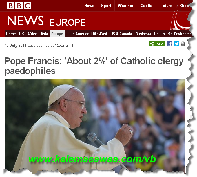![]() اللهم صل على محمد وعلى آله وصحبه أجمعين ،، نقرأ في خبر على موقع بي بي سي : ![]() بابا الفاتيكان : %2 من رجال الكنيسة الكاثوليك لهم ميول جنسية اتجاه الاطفال .