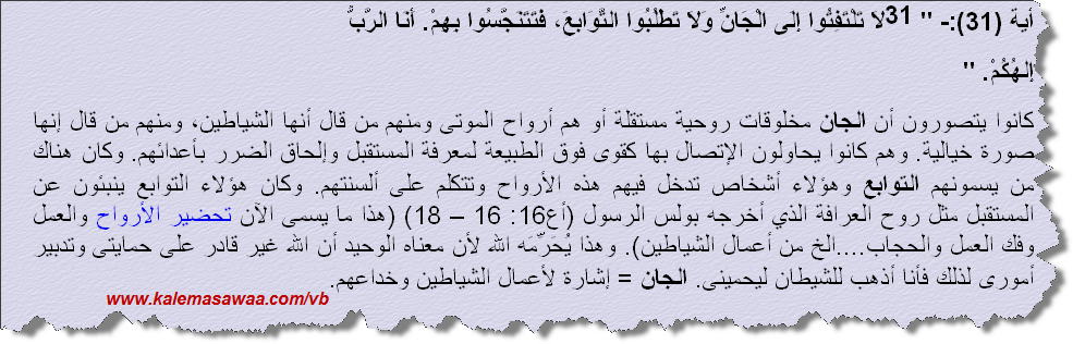 ![]() اللهم صل على محمد وعلى آله وصحبه أجمعين ـ لطالما إستنكر زملاء على الجانب الآخر وجود الجنّ و إعتبروه ضربا من ضروب الخيال ،، نقرأ في لا ويين 19 : 31 لا تلتفتوا الى الجان ولا تطلبوا التوابع فتتنجسوا بهم.انا الرب الهكم. ![]() يُطالعنا أنطونيوس فكري بهذا التفسير : ![]() و نذكّر بقول الكتاب : فتشوا الكتب / يو حنّا 5 : 39 تضلون اذ لا تعرفون الكتب / متى 22 : 29 للمزيد من مواضيعي
