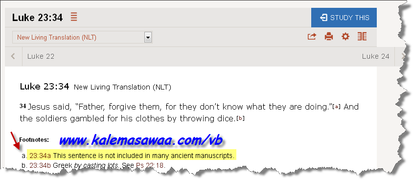 هذا الجزء من لوقا 23 : 34 لا يظهر في أيّ من المخطوطات القديمة وخاصة اليونانية ! ![]() ![]() ![]() نص لوقا 23 : 34 - NLT- Jesus said, “Father, forgive them, for they don’t know what they are doing.”[a] And the soldiers gambled for his clothes by throwing dice جاء في الهامش :