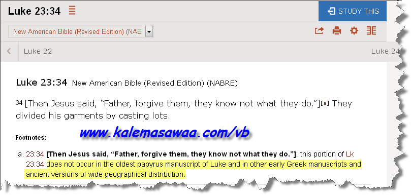 نص لوقا 23 : 34 - NABRE- [Then Jesus said, “Father, forgive them, they know not what they do.”] They divided his garments by casting lots. نقرأ في الهامش :