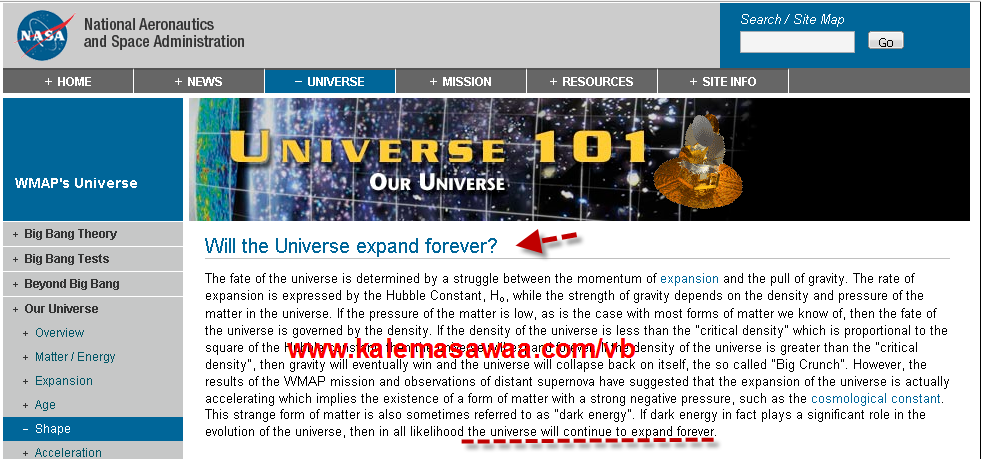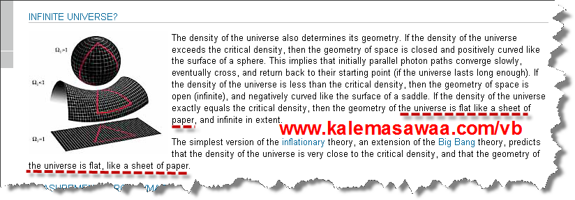![]() اللهم صل على محمد وعلى آله وصحبه أجمعين ، موقع ناسا على الشبكة العنكبوتية يحوي إعجازين كبيرين لقرآننا الكريم : الإعجاز الأوّل : قال تعالى : ![]() سورة الذاريات آية : 47 الكون في توسّع دائم هذا ما اعترفت به وكالة الفضاء الأمريكية ناسا . ![]() الإعجاز الثاني : قال تعالى : ![]() سورة الأنبياء ، آية 104 الكون ( السماء ) مسطّح يشبه الورقة ، و هذا أيضا ما أعترفت به ناسا . ![]() http://map.gsfc.nasa.gov/universe/uni_shape.html الحمدُ لله ربّ العالمين ،، للمزيد من مواضيعي