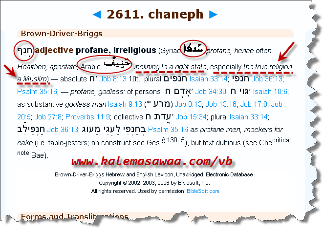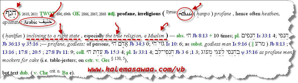 تنبيه: وجب التنويه و التنبيه إلى أنّ القواميس السّريانية أو العبرية أو حتّى البوذية لا تُلزم المسلم في شيء ، هي حجّة على أصحابها فقط ، مانعرضه هنا هو من باب إقامة الحجة على المُخالف ومن بين دفّتي كُتبه ! من قاموس كتاب تلميذ بولس الذي يُقدّس : الكلمة العبري חָנֵף و الكلمة السّرياني ܚܰܢܦ݂ܳܐ مُقابلهما بالعربي هو حنيف و التي معناها : الذي يميل إلى الحالة الصّحيحة ، وخاصّة الدّين / المُعتقد الصّحيح ! حنيف = مسلم . ![]() المصدر المسيحي : أنقر(ي) فضلاً هُنا ![]() حتى الحاخامات اليهود - الحاخام EricLevy كمثال - لم يغردّوا خارج سرب كهنة و قساوسة النّصارى : ![]() المصدر : أنقر(ي) فضلاً هُنا ![]() يُتبع ... |