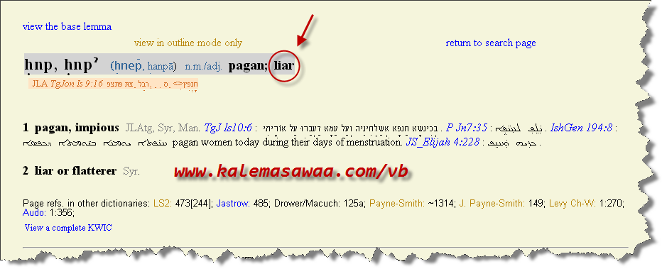 قاموس كتاب مقدّس - و الذي هو حجّة على النّصراني لا المسلم - قدّم معنى حنيف على الشّكل التالي : حنيف = وثني = كاذب ![]() الهولي بايبل قدّم لنا شاؤل ( بُولُس ) المنظّر و المؤسّس الحقيقي لعقيدة الخشبة على أنه شخص يُفاخر باحترافه الكذب ليعلو مجد و شأن الرب ( الربّ المزعوم طبعاً ) : رومية 3 : 7 فَإِنَّهُ إِنْ كَانَ صِدْقُ اللهِ قَدِ ازْدَادَ بِكَذِبِي لِمَجْدِهِ، فَلِمَاذَا أُدَانُ أَنَا بَعْدُ كَخَاطِئٍ؟ ![]() بمقاربة العدد و الوثيقة أعلاه فبولس الكذاب الأشر وثني و بامتياز أيضاً ! ![]() إن كان المنصّر الجويهل يؤمن و يعتقد إعتقاداً راسخاً بجميع المعاني التي تضمنتها القواميس السريانية و العبرية التي استدّل بها في خضمّ مغامرته فذات مرادفات كلمة حنيف : (حنيف = كاذب - وثني – غير مؤمن –مجدف – فاجر ...الخ ) تنطبق انطباقاً كليّا على رسوله ومعلّمه بولُس ! إلى هنا تنتهي مغامرة صبيّ الكنيسة و الذي بدل أن يكون صائداً أصبح طريدة ! المزيد من مواضيعي