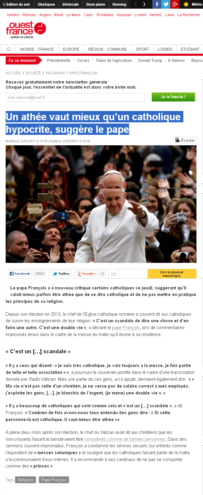 ![]() اللهم صل على محمد وعلى آله وصحبه أجمعين ،، نقرأ من موقع ouest-france.fr خبراً مفاده : ملحد أفضل من مسيحي منافق ! يقول بابا الفاتيكان . ![]() إنتقد بابا الفاتيكان من جديد بعض الكاثوليك بالقول أنه من الأفضل أن يكون المرء مُلحداً على أن يدّعي كونه كاثوليكياً لا يطبّق مبادئ عقيدته !! ![]() للمزيد من مواضيعي