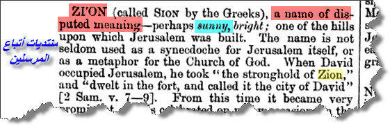 نقرأ من كتاب : ![]() ![]() صاحب الكتاب يقول : معانى كلمة صهيون مُختَلَف حولها !! ![]() لليّ عنق الحقيقة و الخروج من عنق الزجاجة يُضيف الكاتب / الكتبة : ربما ( perhaps)المعنى المقصود : مضيئ ، مُشمس !!