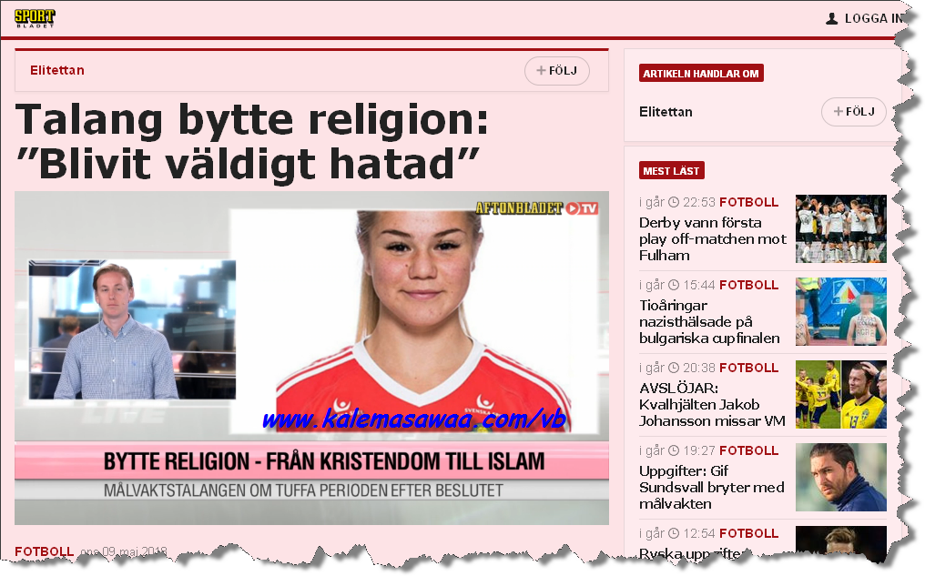![]() اللهم صل على محمد وعلى آله وصحبه أجمعين ،، حارسة مرمى المنتخب السويدي لكرة القدم تحت 19 عاما رونغا أندرسون تخرج من عباءة المسيحية لتعتنق دين التوحيد الإسلام العظيم ! ![]() تقول المهتدية الجديدة في خضم مقابلة مع صحيفة "أفتونبلاديت" :