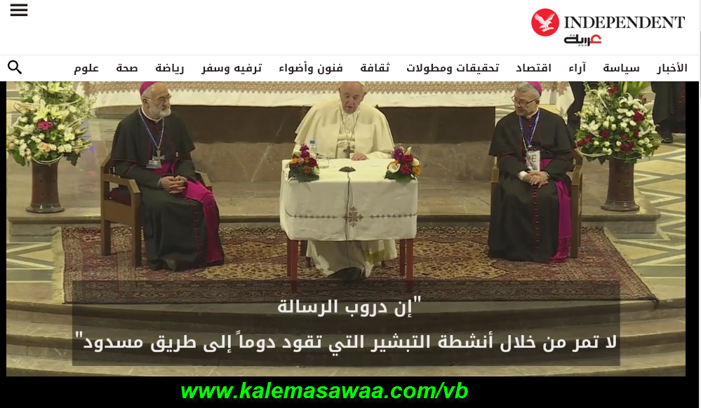 ![]() اللهم صل على محمد وعلى آله وصحبه أجمعين ،، يقيناً التنصير أصبح تجارة فاسدة كاسدة بعد أن سقطت ورقة التّوت عن المنصّرين ( المبشّرين ) وتمّت تعرية وكشف عوار مُعتقد الخشبة خاصة في ظلّ وجود إختراع اسمه نت و ووسائط التواصل الإجتماعي ! بابا الفاتيكان خلال تواجده في زيارة للمغرب وجّه خطابه للمنصّرين الذين ينشطون بهذا القُطر الإسلامي تحت غطاء منظّمات و جمعيات إنسانية و أيضاً مراكز ثقافية قائلاً : " رجاء لا تبشير ! " ،، " دروب التبشير تقود دوماً إلى طريق مسدود " ![]() متى 10 : 16 هَا أَنَا أُرْسِلُكُمْ كَغَنَمٍ فِي وَسْطِ ذِئَابٍ، فَكُونُوا حُكَمَاءَ كَالْحَيَّاتِ وَبُسَطَاءَ كَالْحَمَامِ. برأيي المتواضع ، الحبر الأعظم في تصريحه جمع بين مكر الحيّات و دهاء الثعالب و أيضاً وداعة الحمائم، الهدف من هذه المناورة و المراوغة صرف النّظر عن أنشطة أزلامه وإعطاء سرطان التنصير فرصة ليستجمع أنفاسه و يقوم بترتيب أوراقه ! نسأله تعالى أن يحفظنا جميعاً من كيد ومكر شياطين الجنّ و الإنس ! قولوا أمين ! ![]() ![]() المصدر : www.independentarabia.com للمزيد من مواضيعي