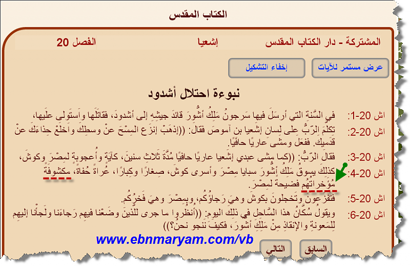 عملاً بقول الكتاب فَتِّشُوا الْكُتُبَ (يوحنا 5 : 39 ) ، الردّ على النّصارى الذين أنكروا على الجانب المسلم استعماله للفظة ( مؤخّرة ) و اعتبروها كلمة نابية خادشة للحياء : إشعياء 20 : 4 (مشتركة ) كذلِكَ يسوقُ مَلِكُ أشُّورَ سبايا مِصْرَ وأسرى كوشَ، صِغارًا وكِبارًا، عُراةً حُفاةً، مكشوفَةً مُؤَخراتُهُم فضيحةً لمِصْرَ. و نذكّر : تيموثاوس الثانية 3 : 16 كُلُّ الْكِتَابِ هُوَ مُوحًى بِهِ مِنَ اللهِ، وَنَافِعٌ لِلتَّعْلِيمِ وَالتَّوْبِيخِ، لِلتَّقْوِيمِ وَالتَّأْدِيبِ الَّذِي فِي الْبِرِّ
