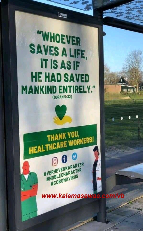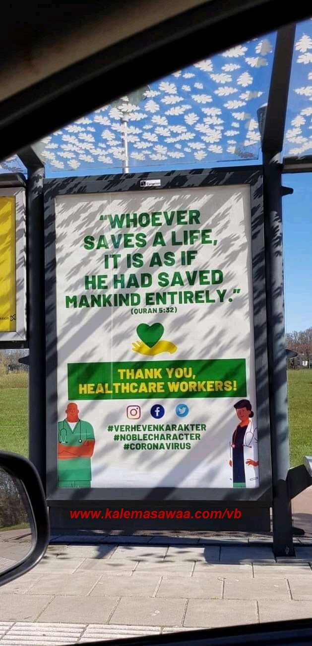 ![]() اللهم صل على محمد وعلى آله وصحبه أجمعين ،، بسبب الظروف الراهنة التي تعيشها أوروبا بسبب جائحة كوفيد -19 مواقف الباصات بهولندا تتزيّن بنص الآية رقم 32 من سورة المائدة التي تدعو إلى حفظ الحياة و إنقاذها من الهلكة . ![]() ![]() ![]() ![]() ![]() ![]() ![]() للمزيد من مواضيعي