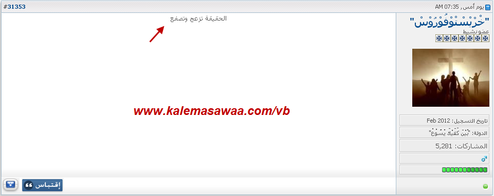 ![]() اللهم صل على محمد وعلى آله وصحبه أجمعين ،، يوحنا 10: 27 خِرَافِي تَسْمَعُ صَوْتِي، وَأَنَا أَعْرِفُهَا فَتَتْبَعُنِي. حوار أجري على صفحات منتدى الزريبة العربية و تم حذفه من طرف كبيرة المشرفين المنصرة العجوز أمة . خرفان الزريبة لم يدر في خلدهم أن الموضوع يتم تصويره أولاً بأوّل . عن الجانب المسلم : Fblau عن الجانب المسيحي: المنصّرة التي تُدعى الملكة هيلانة كان هذا عنوان الموضوع : ![]() صورة بتاريخ اليوم للملف الشخصي للمحاور المسلم بعد حذف الموضوع و تصفير عدّاد مشاركاته : ![]() تعليق في قسم آخر لأحد المسيحيين المحترمين الذي تدخل بشكل إيجابي في الموضوع بعد أن تمّ توبيخه و تقريعه من طرف المنصّرة العجوز أمة كبيرة مشرفي الزريبة العربية : ![]() نص الشبهة : ![]() العملية تمّت بإنزال خفيّ خلف دفاعات المنصّرين و قد أختير لها إسم fall blau :) ![]() ملاحظة: شكر و تقدير للاخ " مؤمن آل فرعون " يُتبع بالنّشر بعد جهوزية باقي الصّور ...... للمزيد من مواضيعي