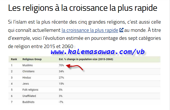 ![]() اللهم صل على محمد وعلى آله وصحبه أجمعين ،، بالإحصائيات التسونامي قادم ! الإسلام العظيم أسرع الدّيانات إنتشاراً في العالم : Les religions à la croissance la plus rapide Si l’islam est la plus récente des cinq grandes religions, c’est aussi celle qui connaît actuellement la croissance la plus rapide au monde. À titre d’exemple, voici l’évolution estimée en pourcentage des sept catégories de religion entre 2015 et 2060 : المصدر ![]() للمزيد من مواضيعي