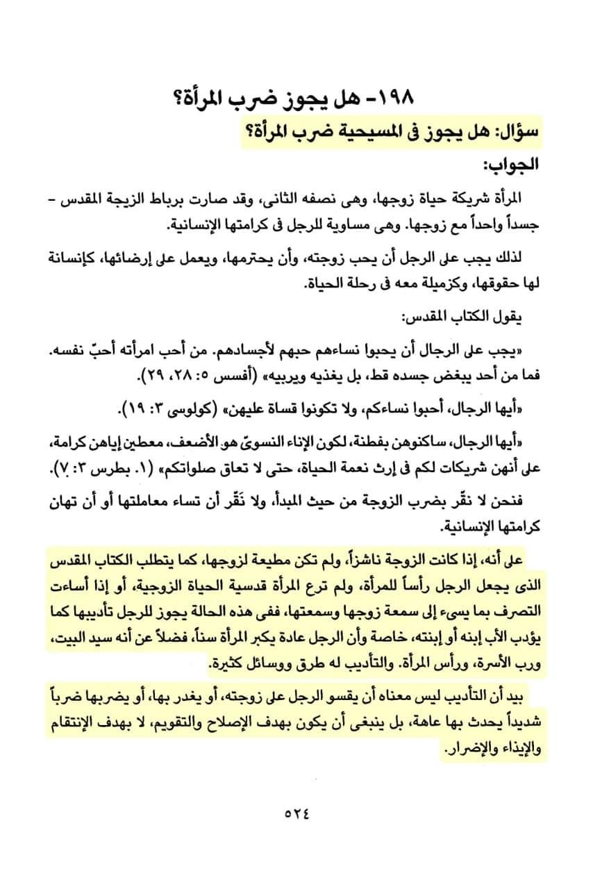 ![]() اللهم صل على محمد وعلى آله وصحبه أجمعين ، ![]() ملاحظة: أدناه تجميعية لمراجع مسيحيّة تفيد بجواز ضرب المراة المسيحية . شكر و تقدير للأخ محمد فايد ، منتدى حُرّاس العقيدة الشّقيق . ملاخي 2 :7 لأَنَّ شَفَتَيِ الْكَاهِنِ تَحْفَظَانِ مَعْرِفَةً، وَمِنْ فَمِهِ يَطْلُبُونَ الشَّرِيعَةَ، لأَنَّهُ رَسُولُ رَبِّ الْجُنُودِ هذا ما خطّه قلم الكهنة المتكلّمين بإرشاد و إلهام و توجيه من روح النّصارى القُدُس : ![]() ![]() للمزيد من مواضيعي