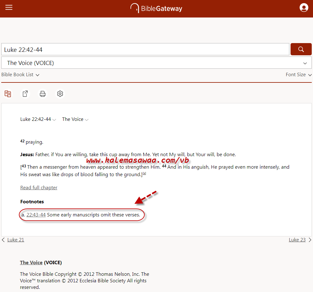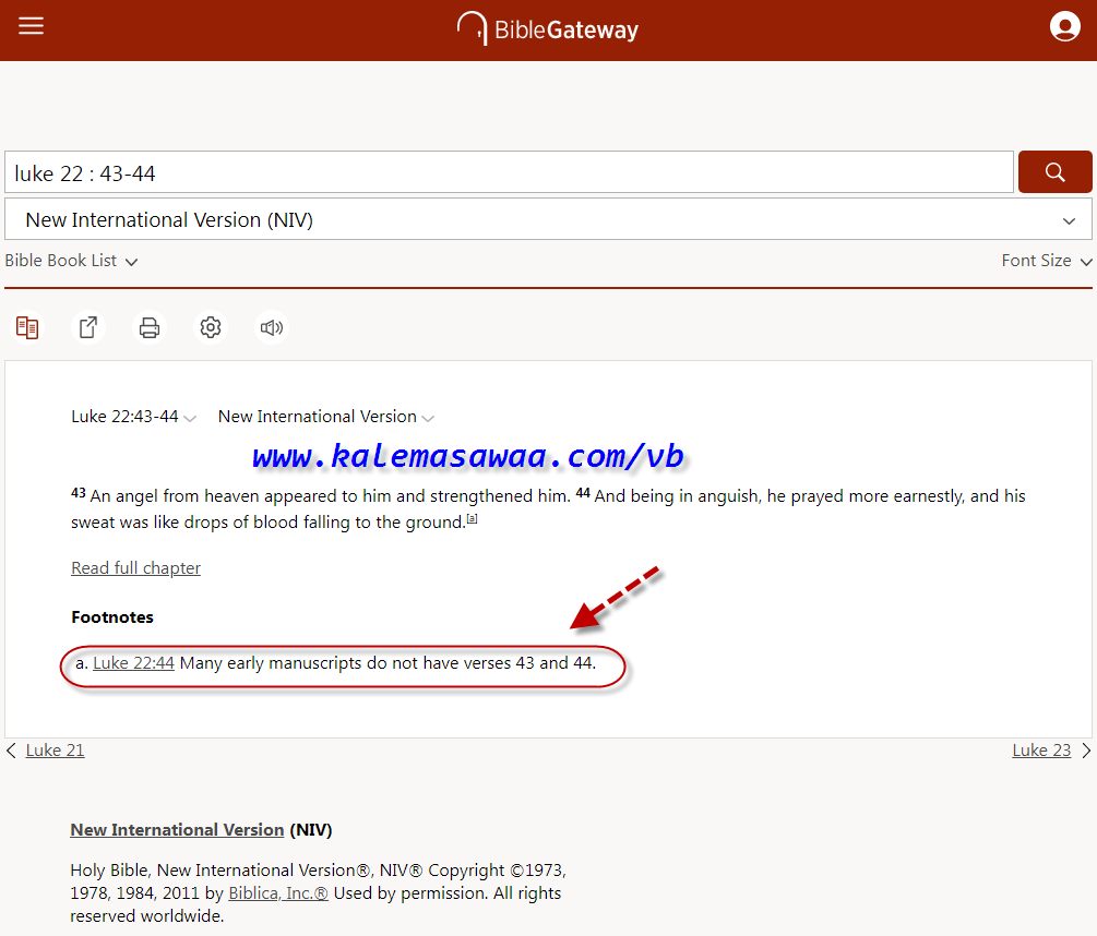تأكيد لما قاله المفسّر المسيحي ديفيد كوزيك بشأن لوقا 22 : 43 -44 نضع بينك أيديكم على سبيل المثال لا الحصر: 1- هامش ترجمة the voice ومنها نقرأ : بعض المخطوطات المبكّرة أخفت هذه النصوص ( المقصود بها العددان 43 - 44 من لوقا 22 ) ![]() ![]() 2- هامش ترجمة NCB ومنها نقرأ : هذان العددان ( المقصود بهما العددان 43 - 44 من لوقا 22 ) لا يوجدان في بعض المخطوطات المبكّرة ![]() ![]() 3- هامش ترجمة NIV ومنها نقرأ : العديد من المخطوطات المبكّرة لا تضم العددين 43 - 44 ![]() ![]() 4- هامش ترجمة LEB ومنها نقرأ : العديد من المخطوطات اليونانية المبكّرة و المهمّة لم تعتمد العددين 43- 44 ![]()