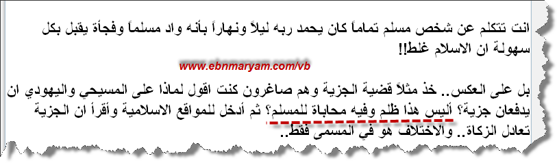 عُدنا و لله الحمدُ ... نواصل مع تدليس المنصّر : ![]() قطّعتٍ قلبي يا ضنايا ! هو تغيير المعتقد بهذه الدرجة من السهولة ! ![]() أمامكم يا سادة إعتراف موثق ، النصراني يعترف أنه ممثل محترف ! يعني التلميذ - المنصّر - يسيرعلى خطى معلمه - بـــولس - ! و لا عجب !!! ![]() المنصّر البائس يعترض على الجزية في الإسلام و عليه نصعقه بما هو آت : ![]() http://st-takla.org/Full-Free-Coptic...5_G/G_105.html كتابك - الموحى به من الروح القدس - أمركَ بدفع الجزية و عن طيب خاطر فلمَ الإعتراض يا هذا ؟؟؟ أشعياء 31 : 8 - ويسقط اشور بسيف غير رجل وسيف غير انسان ياكله فيهرب من امام السيف ويكون مختاروه تحت الجزية 9- وصخره من الخوف يزول ومن الراية يرتعب رؤساؤه يقول الرب الذي له نار في صهيون وله تنور في اورشليم رومية 13 : 1- لتخضع كل نفس للسلاطين الفائقة.لانه ليس سلطان الا من الله والسلاطين الكائنة هي مرتبة من الله 2- حتى ان من يقاوم السلطان يقاوم ترتيب الله والمقاومون سياخذون لانفسهم دينونة. 6- فانكم لاجل هذا توفون الجزية ايضا.اذ هم خدام الله مواظبون على ذلك بعينه. 7- فاعطوا الجميع حقوقهم.الجزية لمن له الجزية. يُتبع بمشيئة الرحمن ...>>> |