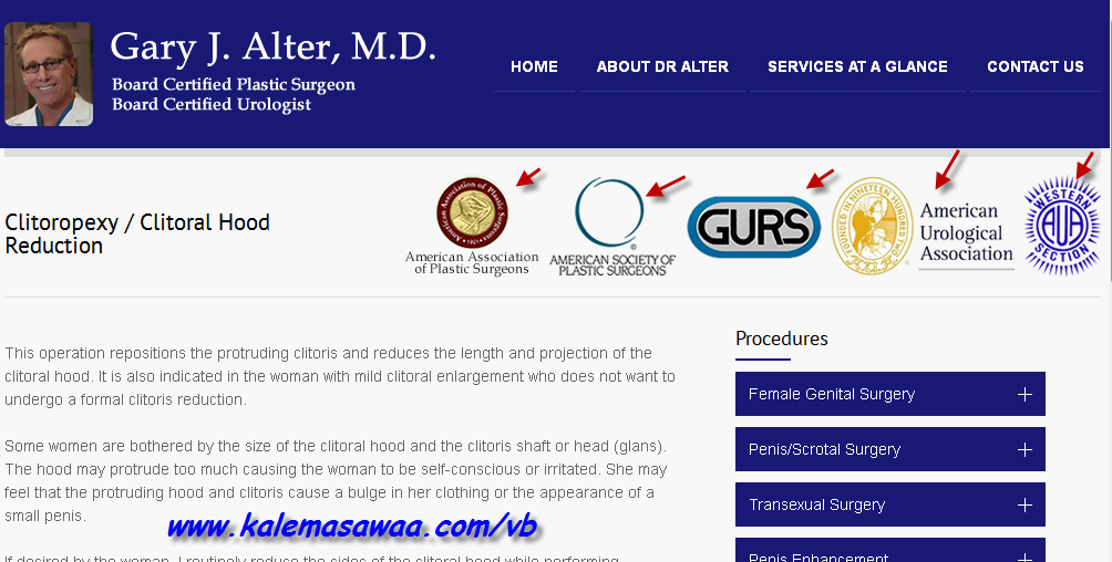 Board Certified Plastic Surgeon Board Certified Urologist Member, American Society of Plastic Surgeons Member, American Association of Plastic Surgeons Member, American Urological Association Member, Society of Genitourinary Reconstructive Surgeons http://www.altermd.com/about_dr_alter.htm المزيد من مواضيعي