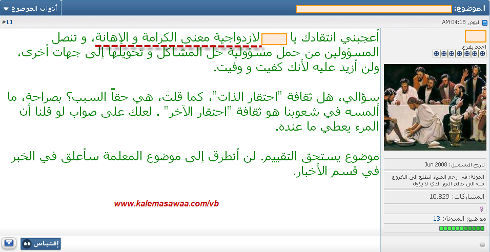 أدناه تعليق كبيرة مشرفي المستنقع التنصيري : ![]() المنصّرة الحقود تعامت عن كون حدث إلقاء موسى النبيّ عليه السّلام موثّق في كتابها الذي تقدّس !لقد شرحنا لهذه السّيدة مدمنة تناول رفات القبور وباقي قطيع المنصّرين أنه لا توجد في نصّ القرآن إهانة جرّاء إلقاء موسى النبيّ عليه السلام للألواح ! ماعسانا نفعل ؟؟؟ لا حياة لمن تنادي ، الجهل بعقيدتها ضارب و مستحكم ! نصيحة للمشرفة النّصرانية : سيبك من ميدان مقارنة الأديان و إتلهي في تغيير حفّاظات " البامبرز" بتاعت الواد !