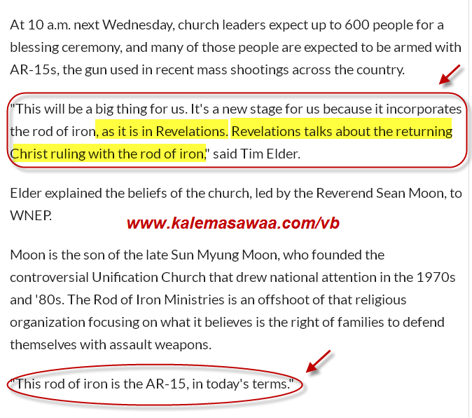 الجواب على لسان أحد القائمين على هذه الكنيسة ! يسوع الإنجيلي سيحكم العالم خلال مجيئه الثاني بسلاح رشاش نصف آلي تحديداً من نوع AR- 15 ( الصورة أدناه ) ![]() الكلام أعلاه هو على عُهدة المتحدّث الرّسمي بإسم الكنيسة و الذي إستشهد على كلامه خلال مقابلة تلفزيونية بنص رؤيا أصحاح 2 عدد 27 ! فَيَرْعَاهُمْ بِقَضِيبٍ مِنْ حَدِيدٍ، كَمَا تُكْسَرُ آنِيَةٌ مِنْ خَزَفٍ، كَمَا أَخَذْتُ أَنَا أَيْضًا مِنْ عِنْدِ أَبِي، ![]() ![]() ![]() للإطلاع على الخبر و أيضا مشاهدة المقابلة التلفزيونية من المصدر برجاء النقر هُنا . دمتم سالمين . |