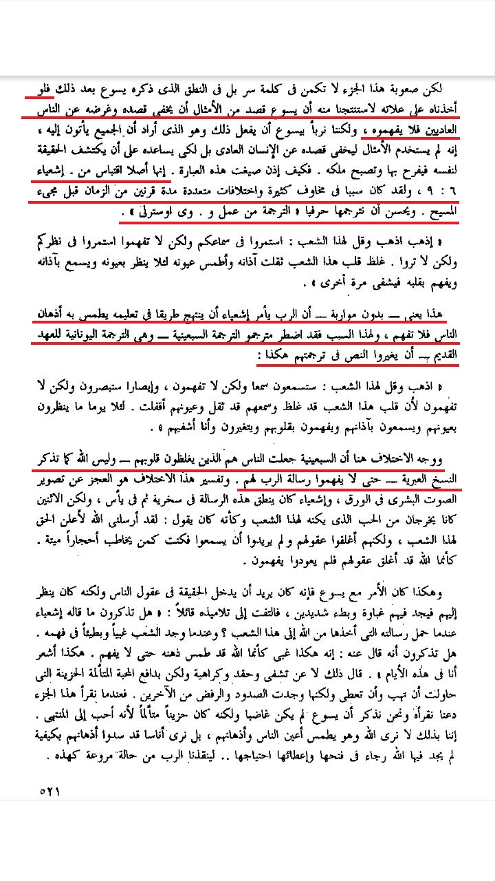 إنجيل مرقس 4 1 وَابْتَدَأَ أَيْضًا يُعَلِّمُ عِنْدَ الْبَحْرِ، فَاجْتَمَعَ إِلَيْهِ جَمْعٌ كَثِيرٌ حَتَّى إِنَّهُ دَخَلَ السَّفِينَةَ وَجَلَسَ عَلَى الْبَحْرِ، وَالْجَمْعُ كُلُّهُ كَانَ عِنْدَ الْبَحْرِ عَلَى الأَرْضِ. 2 فَكَانَ يُعَلِّمُهُمْ كَثِيرًا بِأَمْثَال. وَقَالَ لَهُمْ فِي تَعْلِيمِهِ: «اسْمَعُوا! هُوَذَا الزَّارِعُ قَدْ خَرَجَ لِيَزْرَعَ، 4 وَفِيمَا هُوَ يَزْرَعُ سَقَطَ بَعْضٌ عَلَى الطَّرِيقِ، فَجَاءَتْ طُيُورُ السَّمَاءِ وَأَكَلَتْهُ. 5 وَسَقَطَ آخَرُ عَلَى مَكَانٍ مُحْجِرٍ، حَيْثُ لَمْ تَكُنْ لَهُ تُرْبَةٌ كَثِيرَةٌ، فَنَبَتَ حَالًا إِذْ لَمْ يَكُنْ لَهُ عُمْقُ أَرْضٍ. 6 وَلكِنْ لَمَّا أَشْرَقَتِ الشَّمْسُ احْتَرَقَ، وَإِذْ لَمْ يَكُنْ لَهُ أَصْلٌ جَفَّ. 7 وَسَقَطَ آخَرُ فِي الشَّوْكِ، فَطَلَعَ الشَّوْكُ وَخَنَقَهُ فَلَمْ يُعْطِ ثَمَرًا. 8 وَسَقَطَ آخَرُ فِي الأَرْضِ الْجَيِّدَةِ، فَأَعْطَى ثَمَرًا يَصْعَدُ وَيَنْمُو، فَأَتَى وَاحِدٌ بِثَلاَثِينَ وَآخَرُ بِسِتِّينَ وَآخَرُ بِمِئَةٍ». 9 ثُمَّ قَالَ لَهُمْ: «مَنْ لَهُ أُذُنَانِ لِلسَّمْعِ، فَلْيَسْمَعْ» 10 وَلَمَّا كَانَ وَحْدَهُ سَأَلَهُ الَّذِينَ حَوْلَهُ مَعَ الاثْنَيْ عَشَرَ عَنِ الْمَثَلِ، 11 فَقَالَ لَهُمْ: «قَدْ أُعْطِيَ لَكُمْ أَنْ تَعْرِفُوا سِرَّ مَلَكُوتِ اللهِ. وَأَمَّا الَّذِينَ هُمْ مِنْ خَارِجٍ فَبِالأَمْثَالِ يَكُونُ لَهُمْ كُلُّ شَيْءٍ، 12 لِكَيْ يُبْصِرُوا مُبْصِرِينَ وَلاَ يَنْظُرُوا، وَيَسْمَعُوا سَامِعِينَ وَلاَ يَفْهَمُوا، لِئَلاَّ يَرْجِعُوا فَتُغْفَرَ لَهُمْ خَطَايَاهُمْ». 13 ثُمَّ قَالَ لَهُمْ: «أَمَا تَعْلَمُونَ هذَا الْمَثَلَ؟ فَكَيْفَ تَعْرِفُونَ جَمِيعَ الأَمْثَالِ؟ وجاء في تفسير تادرس يعقوب مالطي هذا التسائل سادسًا: في لقاء الاثني عشر مع السيد، إذ سألوه عن المثل أجاب: "قد أُعطى لكم أن تعرفوا سرّ ملكوت الله، وأما الذين هم من خارج فبالأمثال يكون لهم كل شيء. لكي يبصروا مبصرين ولا ينظروا، ويسمعوا سامعين ولا يفهموا، لئلا يرجعوا، فتغفر لهم خطاياهم" [11-12]. وقد أثارت هذه الإجابة تساؤلات الكثير من الدارسين: كيف يكون هذا؟ ألا يريد السيد من البشرية أن تفهم تعليمه وتتمتع بخلاصه، وتنال غفران الخطايا؟ وجاء أيضاً عن هذا النص مرقس 4 ترجمة الفاندايك 12 لِكَيْ يُبْصِرُوا مُبْصِرِينَ وَلاَ يَنْظُرُوا، وَيَسْمَعُوا سَامِعِينَ وَلاَ يَفْهَمُوا، لِئَلاَّ يَرْجِعُوا فَتُغْفَرَ لَهُمْ خَطَايَاهُمْ». مرقس 4 الترجمة الكاثوليكية غاية يسوع من الأمثال مر 4-10: فلَمَّا اعتَزَلَ الجَمْع، سأَلَه الَّذينَ حَولَه معَ الاثْنَي عَشَرَ عنِ الأَمثال. مر 4-11:فقالَ لَهم: ((أَنتُم أُعطيتُم سِرَّ مَلكوتِ الله. وأَمَّا سائرُ النَّاس فكُلُّ شَيءٍ يُلقى إِلَيهِم بِالأَمثال مر 4-12:فيَنظُرونَ نَظَراً ولا يُبصِرون ويَسمَعونَ سَماعاً ولا يَفهَمون لِئَلاَّ يَرجِعوا فَيُغفَرَ لَهم)). مرقس 4 الترجمة العربية المشتركة مغزى الأمثال مر 4-10:فلمَّا كانَ على اَنفِرادٍ، سألَهُ أتباعُهُ والرُّسُلُ الإثنا عشَرَ عَنْ مَغزى الأمثالِ، مر 4-11:فقالَ لهُم: ((أنتُم أُعطِيتُم سرَّ مَلكوتِ اللهِ. وأمَّا الّذينَ مِنْ خارِجٍ فيَسمَعونَ كُلَّ شيءٍ بالأمثالِ، مر 4-12:حتّى إنَّهُم: مَهما نَظَروا لا يُبصِرونَ،ومَهما سَمِعوا لا يَفهَمونَ ، لئلاَّ يَتوبوا فتُغفَرَ لهُم خطاياهُم )). مرقس 4 الترجمة البولسية مر 4-10:ولمَّا انْفردَ سأَلَهُ الذَّينَ حَوْلَهُ، مَعَ الاثَنْي عَشَرَ، عَنِ الأَمثال. مر 4-11:فَقالَ لَهم: "أَنْتم قد أُوتيتُم أَنْ تَعْرِفوا سِرَّ مَلكوتِ اللهِ. وأَمَّا أُولئكَ، الذَّينَ في الخارجِ فكلُّ شَيءٍ لهم بأَمْثال. مر 4-12:لكَيْ يَنْظُروا نَظَرًا ولا يُبْصِروا، ويسَمْعوا سَماعًا ولا يَفْهموا، لئلاَّ يَتوبُوا فيُغْفَرَ لهم". مر 4-13:ثمَّ قالَ لهم: "أَمَا تَفْهمونَ هذا المَثَل؟ فكَيفَ إِذَنْ تَفْه