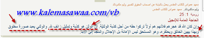 ![]() نقرأ من الكتاب : رومية 1 :25 الَّذِينَ اسْتَبْدَلُوا حَقَّ اللهِ بِالْكَذِبِ، وَاتَّقَوْا وَعَبَدُوا الْمَخْلُوقَ دُونَ الْخَالِقِ، الَّذِي هُوَ مُبَارَكٌ إِلَى الأَبَدِ. آمِينَ. ومن التفسير المصاحب : 1- بقلم وليم ماكدونالد: