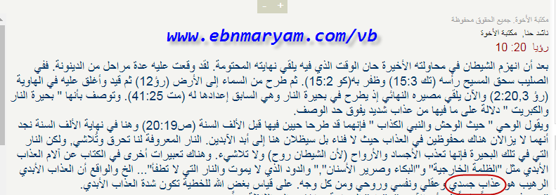 ![]() اللهمّ صلّ و سلّم وزد و بارك على الحبيب المصطفى سيّدنا محمّد ،، نقرأ رؤيا 20 : 7- 10 ثُمَّ مَتَى تَمَّتِ الأَلْفُ السَّنَةِ يُحَلُّ الشَّيْطَانُ مِنْ سِجْنِهِ، وَيَخْرُجُ لِيُضِلَّ الأُمَمَ الَّذِينَ فِي أَرْبَعِ زَوَايَا الأَرْضِ: جُوجَ وَمَاجُوجَ، لِيَجْمَعَهُمْ لِلْحَرْبِ، الَّذِينَ عَدَدُهُمْ مِثْلُ رَمْلِ الْبَحْرِ. فَصَعِدُوا عَلَى عَرْضِ الأَرْضِ، وَأَحَاطُوا بِمُعَسْكَرِ الْقِدِّيسِينَ وَبِالْمَدِينَةِ الْمَحْبُوبَةِ، فَنَزَلَتْ نَارٌ مِنْ عِنْدِ اللهِ مِنَ السَّمَاءِ وَأَكَلَتْهُمْ. وَإِبْلِيسُ الَّذِي كَانَ يُضِلُّهُمْ طُرِحَ فِي بُحَيْرَةِ النَّارِ وَالْكِبْرِيتِ، حَيْثُ الْوَحْشُ وَالنَّبِيُّ الْكَذَّابُ. وَسَيُعَذَّبُونَ نَهَارًا وَلَيْلاً إِلَى أَبَدِ الآبِدِينَ. من التّفسير المُصاحب بقلم ناشد حنا المتكلم بإلهام و إرشاد و توجيه روح النّصارى القُدُس نقرأ :