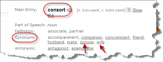 متأكد؟؟؟ نشوف الترجمة ثاني كده : ![]() consort = زوجة companion = رفيقة ، صاحبة الظاهر إنك أعمى يا بني . روح شوف لك دكتور يا .........دكتور ! http://jwa.org/encyclopedia/article/...hasherim-bible
